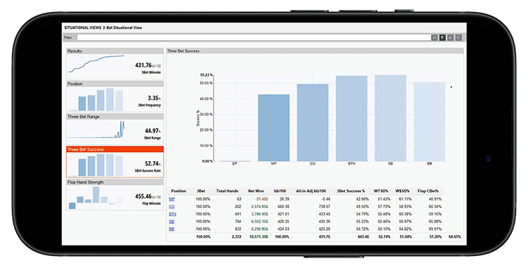 В трекер интегрирован мощный пакет инструментов для обзора собственной игры и выявления ее слабых сторон. Для этого пользователь может выбрать любой из 25 готовых отчетов: например, по виду покера, лимиту, позиции, типу рук или комбинациям. На экране появится сводная таблица с данными, графиками и диаграммами.