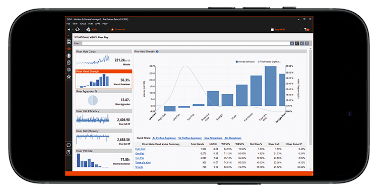 Покер — игра с неполной информацией, в которой участникам приходится строить предположения о диапазонах соперников, силе их рук, возможных действиях в ответ на ту или иную ставку. Подобную задачу упрощает Holdem Manager 3 — мощный трекер, который интегрируется с клиентским софтом и отображает показатели статистики по оппонентам прямо за игровым столом. Также ПО сохраняет историю раздач и поддерживает большой набор инструментов для их анализа. Это позволяет пользователю выявлять свои ошибки, отслеживать удачные ходы оппонентов и системно улучшать стратегию. Игрок может скачать Holdem Manager 3 и пользоваться им бесплатно в течение 14 дней. Этого времени достаточно, чтобы оценить удобство и возможности трекера.